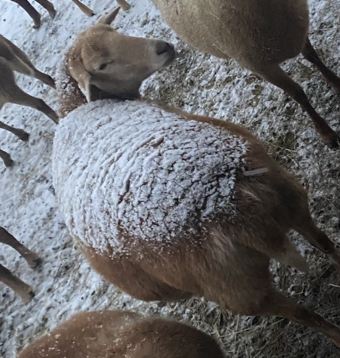 Bei „sibirischer“ Kälte könnte ich mir jedoch vorstellen, dass Wollschafe, vor allem dann durch den bewollten Bauch, einen besseren Wärmeschutz aufweisen. Aber bei den hiesigen Temperaturen im Mittelgebirge sehen ich bei Haarschafen keinerlei Nachteile. Wie man auf dem Foto erkennt, bleibt der Schnee auf dem Rücken liegen, was für eine gute Isolierung des Winterfells bei Haarschafen spricht.